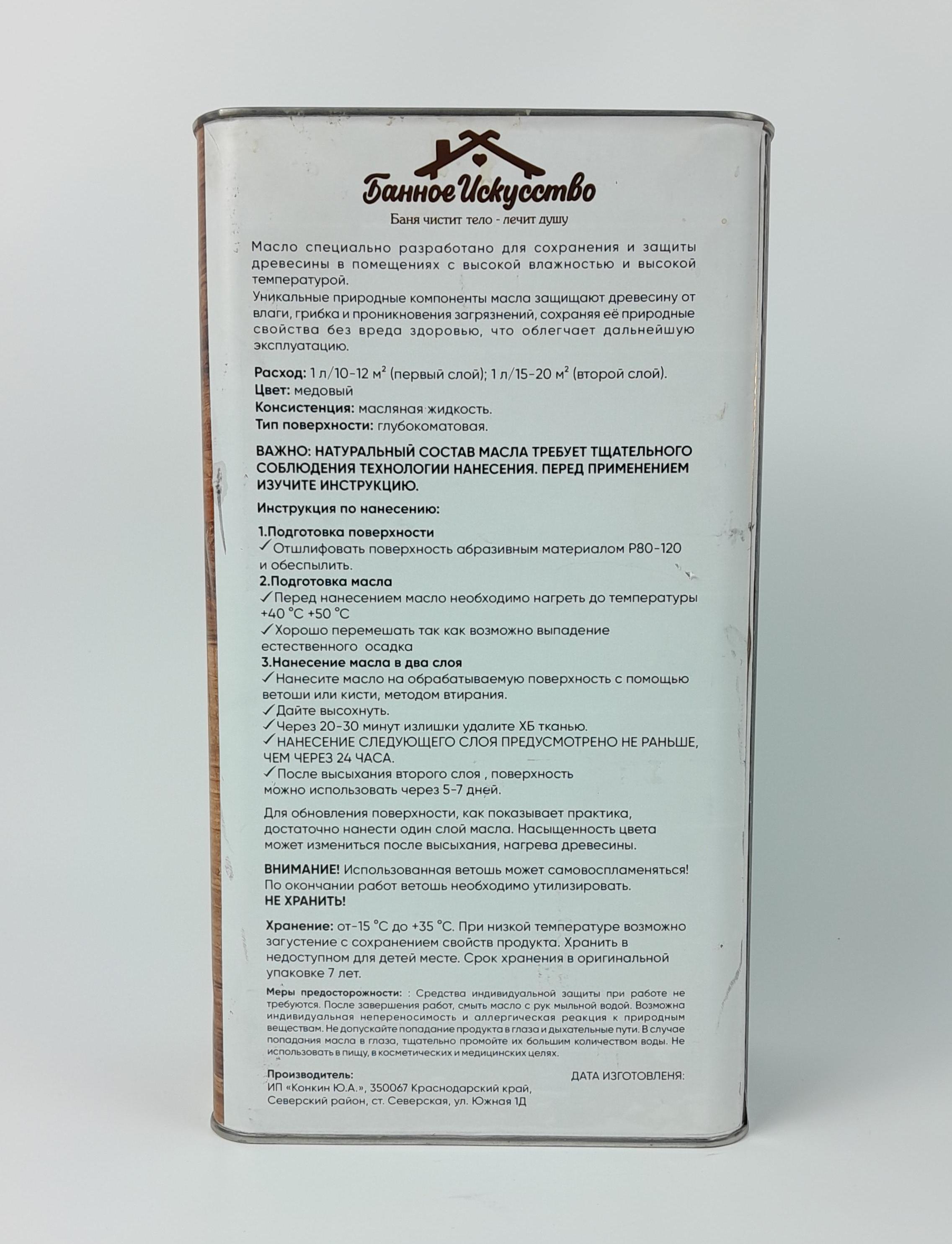Описание: Концентрированное масло для деревянных поверхностей в парной: полков, скамей, спинок, вагонки. Проникает в структуру древесины на 3–5 мм — создаёт водоотталкивающий барьер изнутри, а не покрытие снаружи. Не темнеет от конденсата, не выделяет запахов при нагреве до +100 °C. Состав: Льняное и рыжиковое масла холодного отжима, пчелиный воск, сосновая живица, медицинский скипидар, микровоск. Без свинцовых сиккативов, синтетических отдушек и растворителей. Особенности: