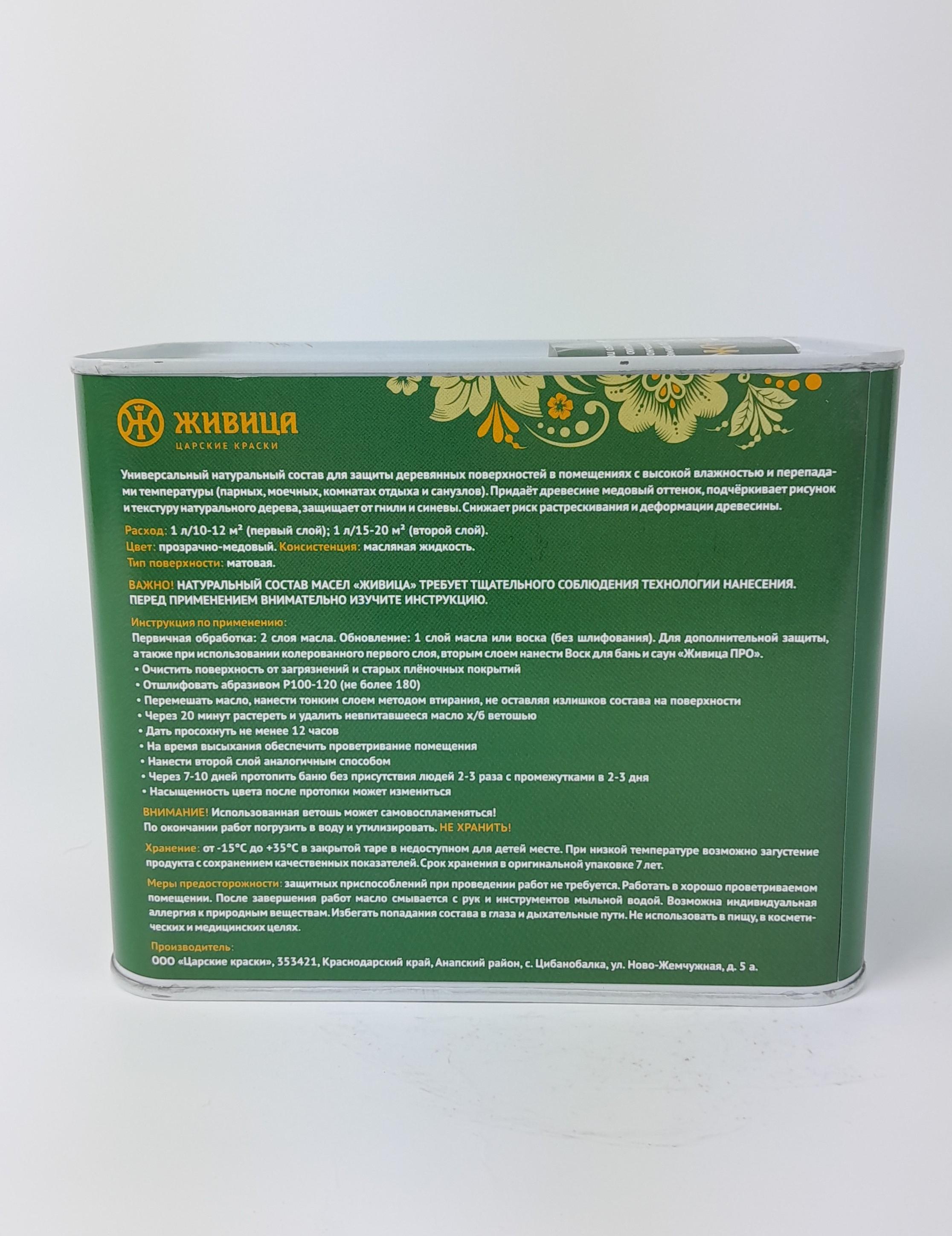 Описание: Масло «Живица» разработано специально для деревянных поверхностей в банях и саунах, где дерево ежедневно испытывает резкие перепады температуры и влажности. Оно глубоко проникает в структуру древесины, укрепляя её изнутри и обеспечивая долговечную защиту без образования плёнки. Подходит для: - вагонки на стенах и потолке, - полков и скамеек в парной, - деревянных полов в моечной, - дверей, лестниц, аксессуаров. Ключевые свойства: 1. Защищает от влаги, грибка, плесени и загрязнений 2. Повышает устойчивость дерева к деформации и растрескиванию 3. Сохраняет естественный цвет и текстуру — не желтит, не «поджигает» 4. Безопасно для контакта с телом в неколерованном виде 5. Рекомендуется наносить в 2 слоя для максимальной защиты 6. Колеровка допустима только для поверхностей, не соприкасающихся с кожей (например, стены, потолки, двери). Применение: - Древесина должна быть чистой, сухой и отшлифованной (зернистость Р120–180). - Нанесите первый слой кистью или хлопковой тканью вдоль волокон. - Через 6–12 часов — второй слой. - Полное высыхание — 24–48 часов при хорошей вентиляции. - Расход: ~2 л на 20–24 м² (в два слоя, в зависимости от породы дерева). Состав: - Льняное масло - Стандолевое льняное масло (ускоряет полимеризацию) - Сосновая смола (живица) — усиливает водоотталкивающие свойства - Скипидар живичный (двойной очистки) — натуральный растворитель - Отдушка на основе эфирных масел — лёгкий аромат, исчезает после высыхания Масло «Живица» — это проверенная защита, созданная для тех, кто строит баню на долгие годы. Натурально, безопасно, эффективно.