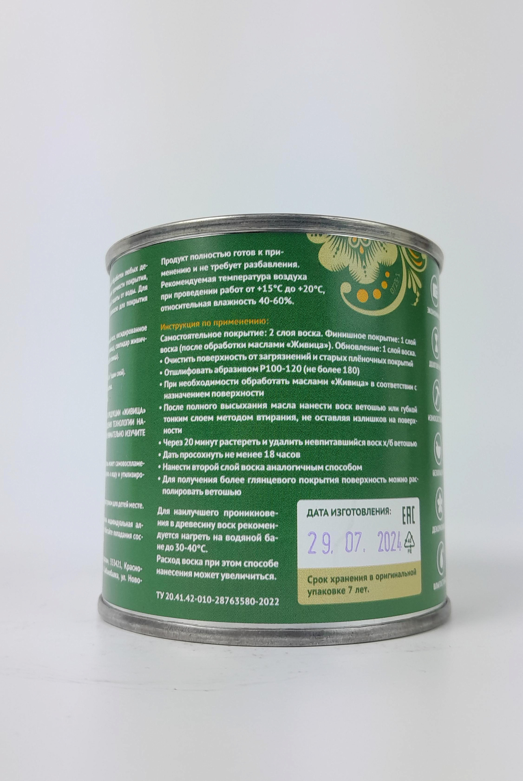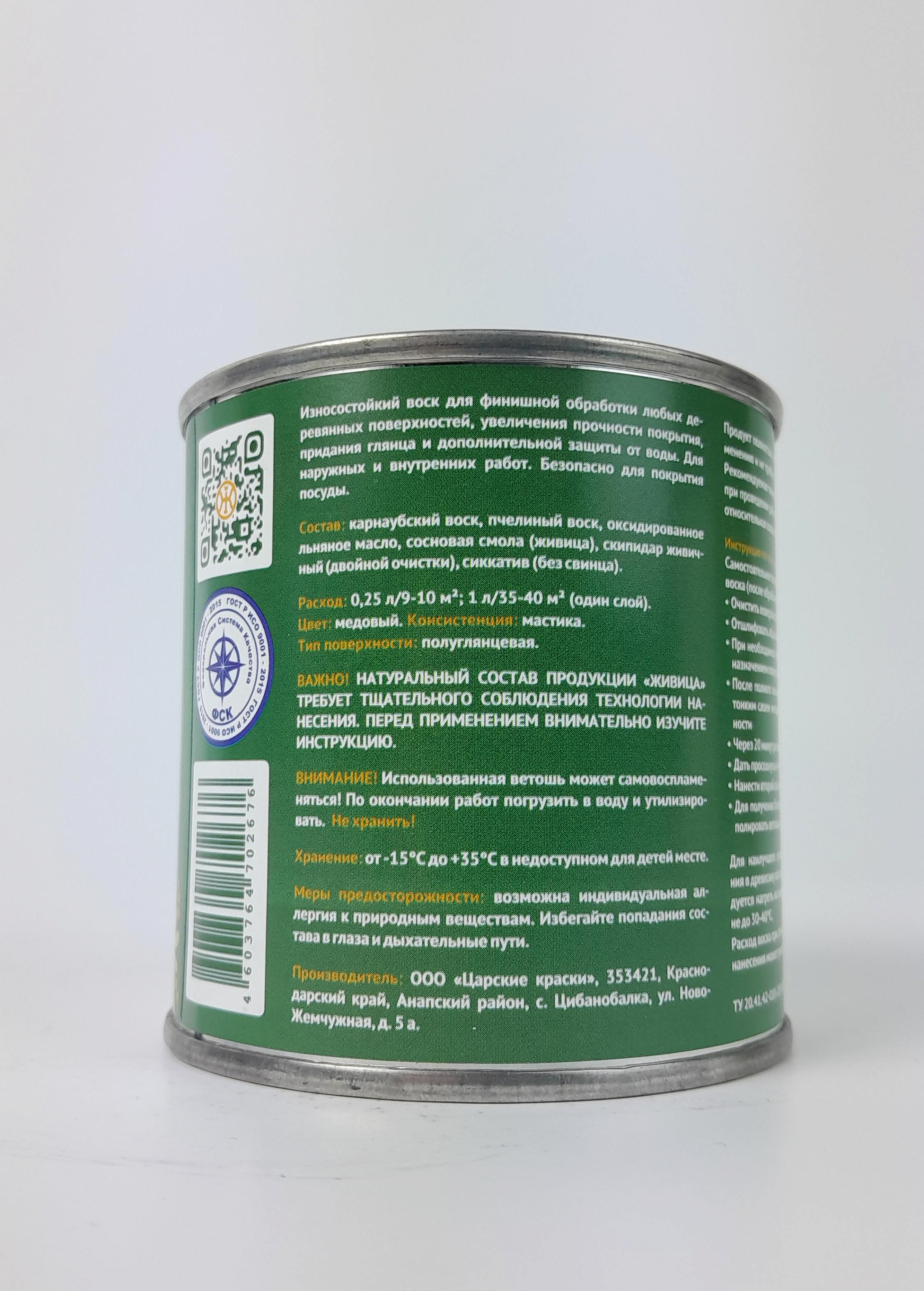 Описание: Воск «Живица Про» — это финальное покрытие для деревянных поверхностей в банях и саунах, наносимое поверх масел («Масло для бань и саун» или «Баня Про»). Он создаёт плотную, но дышащую защиту на участках, подверженных: - частому контакту с водой (полок, ступени, зоны у душа), - интенсивному истиранию (поручни, подлокотники), - скоплению влаги в стыках и соединениях. Ключевые свойства: 1. Высокое содержание карнаубского воска — обеспечивает максимальную водо- и износостойкость 2. Защищает от плесени, грибка и потемнения 3. Безопасен при высоких температурах — не плавится, не выделяет запахов и токсинов 4. Сохраняет естественный вид дерева — не образует плёнки, не желтеет 5. 100% натуральный состав — безопасен для кожи и дыхания Применение: - Наносите только после полного высыхания масляного слоя (24–48 часов). - Используйте мягкую ткань или кисть — нанесите тонким слоем вдоль волокон. - Через 15–20 минут отполируйте сухой хлопковой тканью до лёгкого блеска. - Полное отверждение — в течение 24 часов. - Расход: 0,25 л достаточно для обработки 3–5 м² (в зависимости от породы дерева и степени износа). Состав (натуральный): 1) Карнаубский воск (основной компонент) 2) Пчелиный воск 3) Растительные масла 4) Натуральные растворители (скипидар живичный) «Живица Про» — воск — это не просто финиш, а усиленная защита там, где она нужна больше всего. Для тех, кто ценит долговечность, чистоту и комфорт в бане.