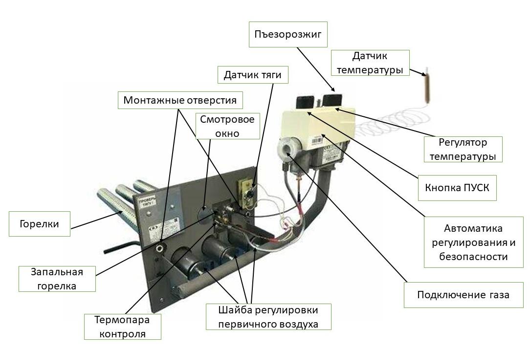 Топливо: природный или сжиженный газ Масса закладываемых камней: не менее 180 кг Диаметр дымохода: 115 мм Время нагрева до 100 °C: 90–120 минут Толщина стали камеры сгорания: 6–8 мм Тип каменки: открытая, вентилируемая Топка: выносная — растопка из соседнего помещения