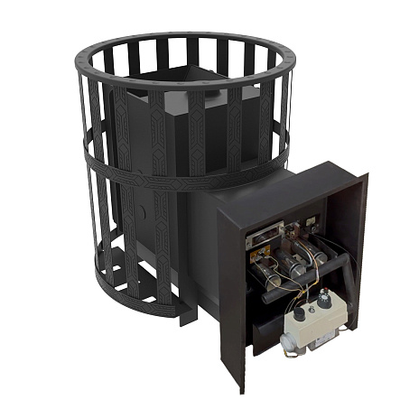 Цельносварная конструкция из высококачественной чёрной стали — толщина топки 6 мм, приёмная плита под основную нагрузку огня — 8 мм Верхняя часть топки выполнена лабиринтом — обеспечивает быстрый и равномерный прогрев камней Вентилируемая каменка — парная прогревается быстрее, пар получается лёгким Сетчатый кожух вмещает большой объём камней — усиливает тепловую инерцию, парная дольше держит жар Газовый блок управления с регулятором — размещён в выносном отсеке, доступен из предбанника