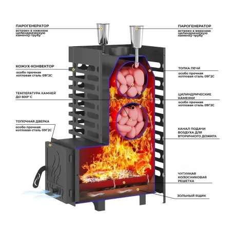 Описание: Мощная дровяная печь ASTON 16 INOX — идеальный выбор для бань объёмом от 14 до 18 м³. Сочетание надёжной конструкции, современного дизайна и продуманных технологических решений делает её одной из самых востребованных моделей в линейке ASTON. Изготовлена из прочной нержавеющей стали AISI 430 толщиной 3 мм, устойчивой к температурам до 800 °C — что значительно превышает рабочий диапазон горения дров (600–700 °C). Это гарантирует долгий срок службы, стабильную работу и безопасность даже при интенсивном использовании. Ключевые особенности: Дверца со стеклом. Размер — 285 × 315 мм, позволяет наблюдать за живым огнём, создавая атмосферу уюта и настоящего камина. Стекло выдерживает высокие температуры и не теряет прозрачности при правильной эксплуатации. Канал дожига газов расположен на задней стенке топки. Обеспечивает: - Повышенный КПД за счёт дополнительного сгорания пиролизных газов - Более чистый дымоход — меньше сажи и конденсата - Экономию топлива и экологичность Внешняя сетка-каменка окружает топку и вмещает 70–80 кг камней (с возможностью добавить ещё 20 кг). Обеспечивает мощный жар и насыщенный пар при плеске водой. Внутренняя закрытая каменка. Подача воды осуществляется через верхнюю воронку, вынесенную наружу. Позволяет получать мягкий, лёгкий, мелкодисперсный пар без резких выбросов — особенно комфортно для дыхательных путей. Выносной топливный канал (опционально) позволяет устанавливать печь так, чтобы топить из смежного помещения — например, из предбанника или комнаты отдыха. Удобно, безопасно и практично. Материал: нержавеющая сталь AISI 430, 3 мм Объём парной: 14–18 м³ Вместимость каменки: 70–100 кг (внешняя + внутренняя) Дверца: со стеклом, 285 × 315 мм Возможность подключения выносного топливного канала Габариты: 670 × 420 × 750 мм (Д × Ш × В) Вес: 51 000 г (51 кг) Преимущества ASTON 16 INOX: - Высокая теплоотдача и стабильный жар - Мягкий пар от закрытой каменки - Эффективный дожиг газов — экономия и чистота - Надёжность и долговечность нержавеющей стали - Эстетичный дизайн с обзорным стеклом - Универсальность установки — можно топить из соседнего помещения Печь ASTON 16 INOX — это сочетание передовой инженерии, натурального тепла и современного комфорта. Выбирайте качество, проверенное временем, и наслаждайтесь каждой минутой в своей бане.