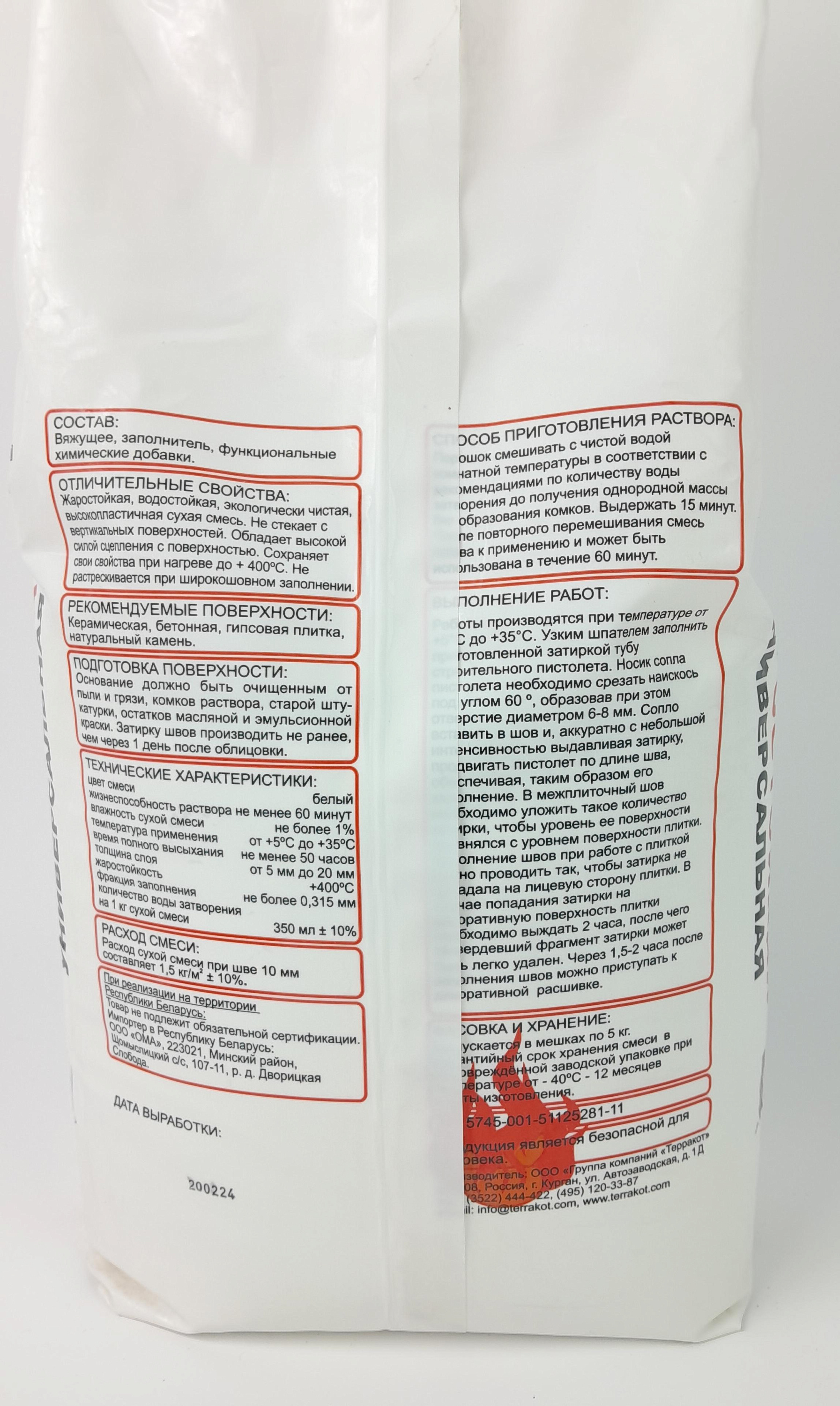 Описание: «Терракот» — это специализированная жаростойкая затирка, разработанная для надёжного и эстетичного заполнения швов в зонах с высокой температурой и влажностью. Подходит как для печей, каминов, барбекю и мангалов, так и для обычных интерьеров. Белая база позволяет колеровать затирку в любой оттенок с помощью минеральных пигментов — идеально для дизайнерских решений. Ключевые преимущества: 1. Выдерживает до +400 °C — не трескается, не выгорает, не теряет цвет 2. Универсальна: подходит для керамической плитки, клинкера, натурального камня, гипса, бетона 3. Идеальна для бани и сауны — устойчива к пару, конденсату и перепадам температур 4. Мелкозернистая структура — даёт гладкий, аккуратный шов без пор и раковин 5. Прочная и износостойкая — не крошится, не истирается даже при интенсивной эксплуатации Удобство в работе: - Время жизнеспособности раствора: 60 минут - Время коррекции шва: до 15 минут после нанесения - Расшивка: через 1,5–2 часа — с помощью проволочного кольца, отвёртки или специального профильного инструмента - Температура проведения работ: от +5 °C до +35 °C - Нанесение: шпателем, резиновым скребком или затирочным пистолетом Подготовка: — Швы должны быть чистыми, сухими, без пыли и остатков клея. — Затирку выполняют не ранее чем через 24 часа после укладки плитки. Где применяется: 1. Облицовка печей, каминов, дымоходов 2. Мангалы, барбекю, уличные очаги 3. Парные, моечные, сауны 4. Кухонные фартуки, полы, стены в жилых помещениях Затирка «Терракот» — это не просто шов, а защита и завершение образа. Надёжность при жаре, чистота в интерьере, свобода в дизайне.