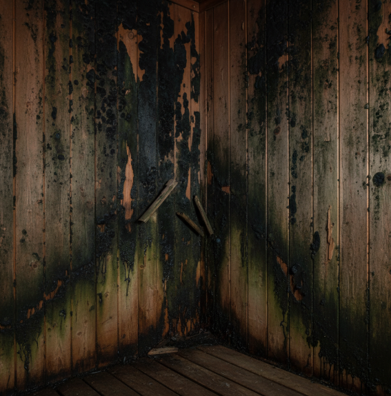 Когда на стенах, полу или потолке появляются тёмные пятна, запах сырости, а дерево становится мягким или темнеет, — это первые признаки плесени.