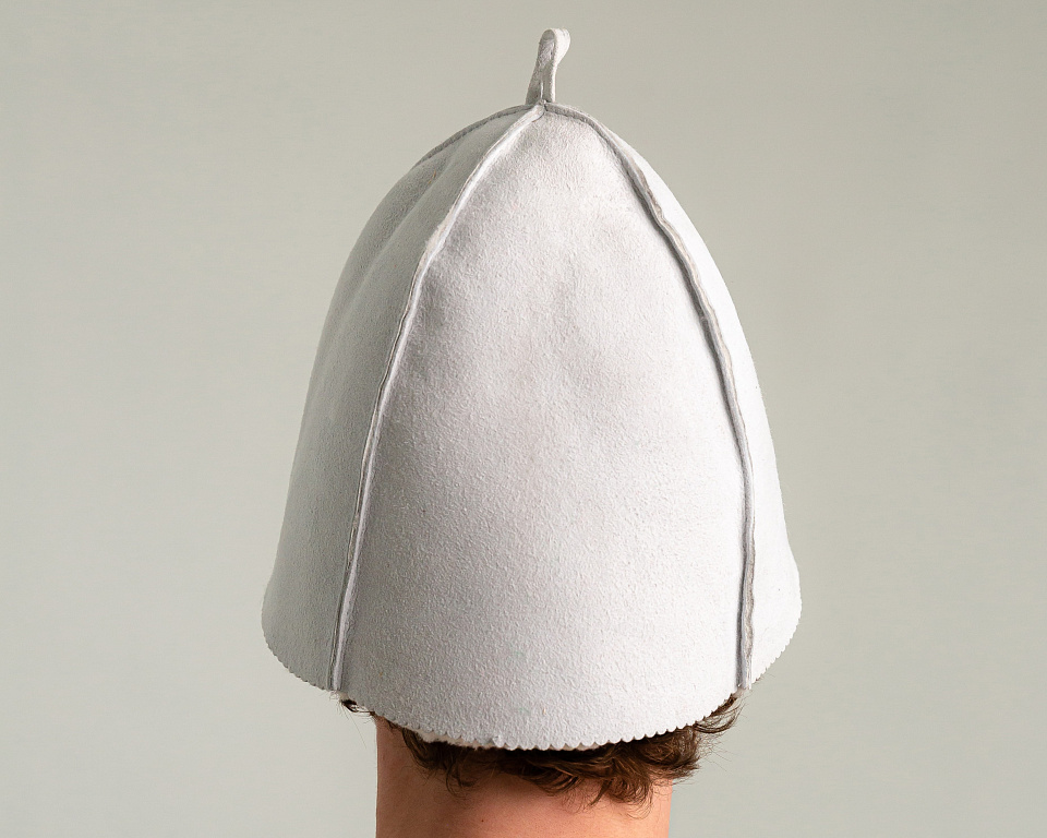 - Классический колпак с высокой тульей — проверенная форма для русской бани. Высокая тулья создаёт воздушную подушку над головой — дополнительный теплоизоляционный слой.