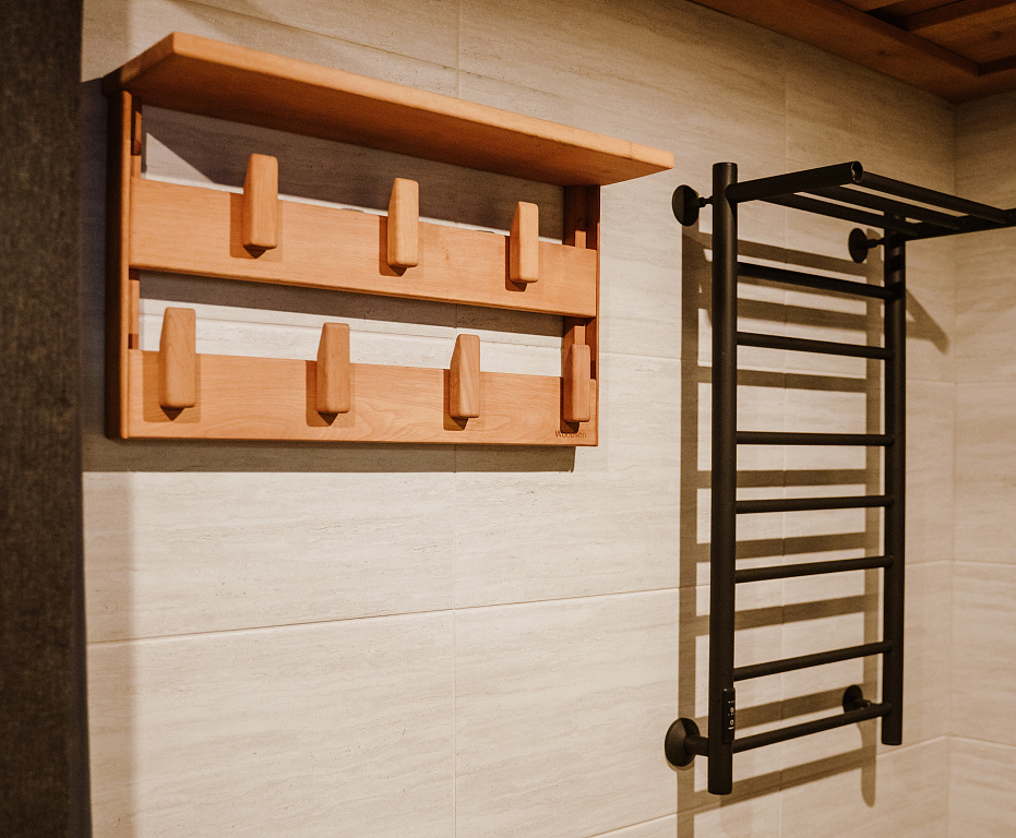 - Один из удачных приёмов — сочетание плитки и дерева. Плитка берёт на себя влагу и нагрузку, дерево остаётся там, где важны тактильные ощущения: лавки, спинки, декоративные панели.
